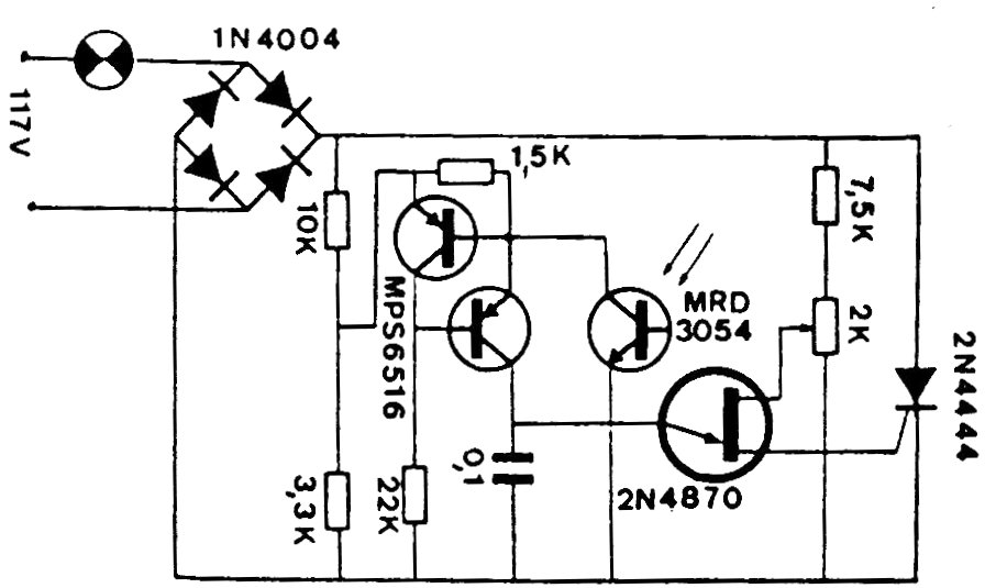 Este circuito utiliza un puente de diodos para obtener control de onda completa con un SCR. Los diodos deben soportar la corriente de la lámpara que debe ser obligatoriamente incandescente. El SCR debe estar dotado de un disipador de calor. Para el 1N4004 la potencia máxima es del orden de 200 W.