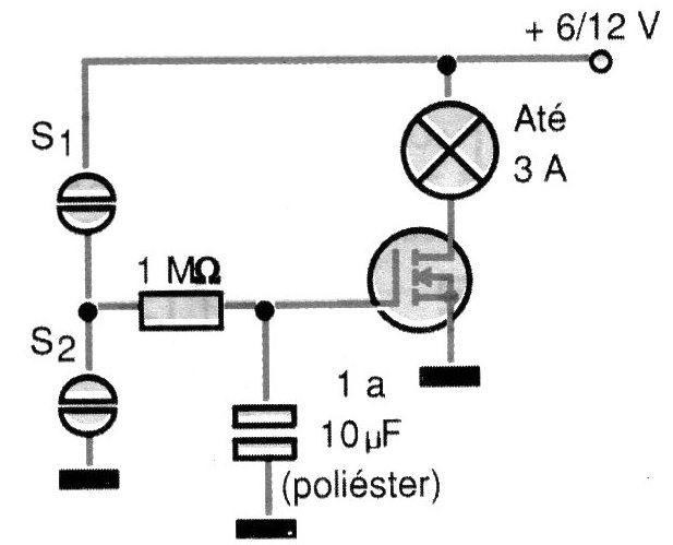 El circuito de la figura posibilita el control de brillo de lámparas de 6 a 12 V (para uso automotor), o aún velocidad de un pequeño motor por el toque en sensores. Tocando en el sensor S1, el capacitor se carga a través de resistor de 1 M ohmios y, a medida que la tensión en sus armaduras se eleva, la tensión sobre la carga aumenta. Cuando se deja de tocar el sensor, la tensión se mantiene en el capacitor durante mucho tiempo (gracias a la elevada impedancia de entrada del FET), lo que garantiza que el brillo de la lámpara se estabilice. Para disminuir el brillo, se toca en S2 cuando el capacitor se descarga a través de la resistencia al mismo tiempo que la corriente en la carga disminuye. El capacitor usado debe ser de excelente calidad (poliéster) para mantener la carga por un buen tiempo (al menos unas decenas de minutos). Observamos que, como la región lineal de control del FET es estrecha este circuito presenta algunas '' bandas muertas 'de actuación.