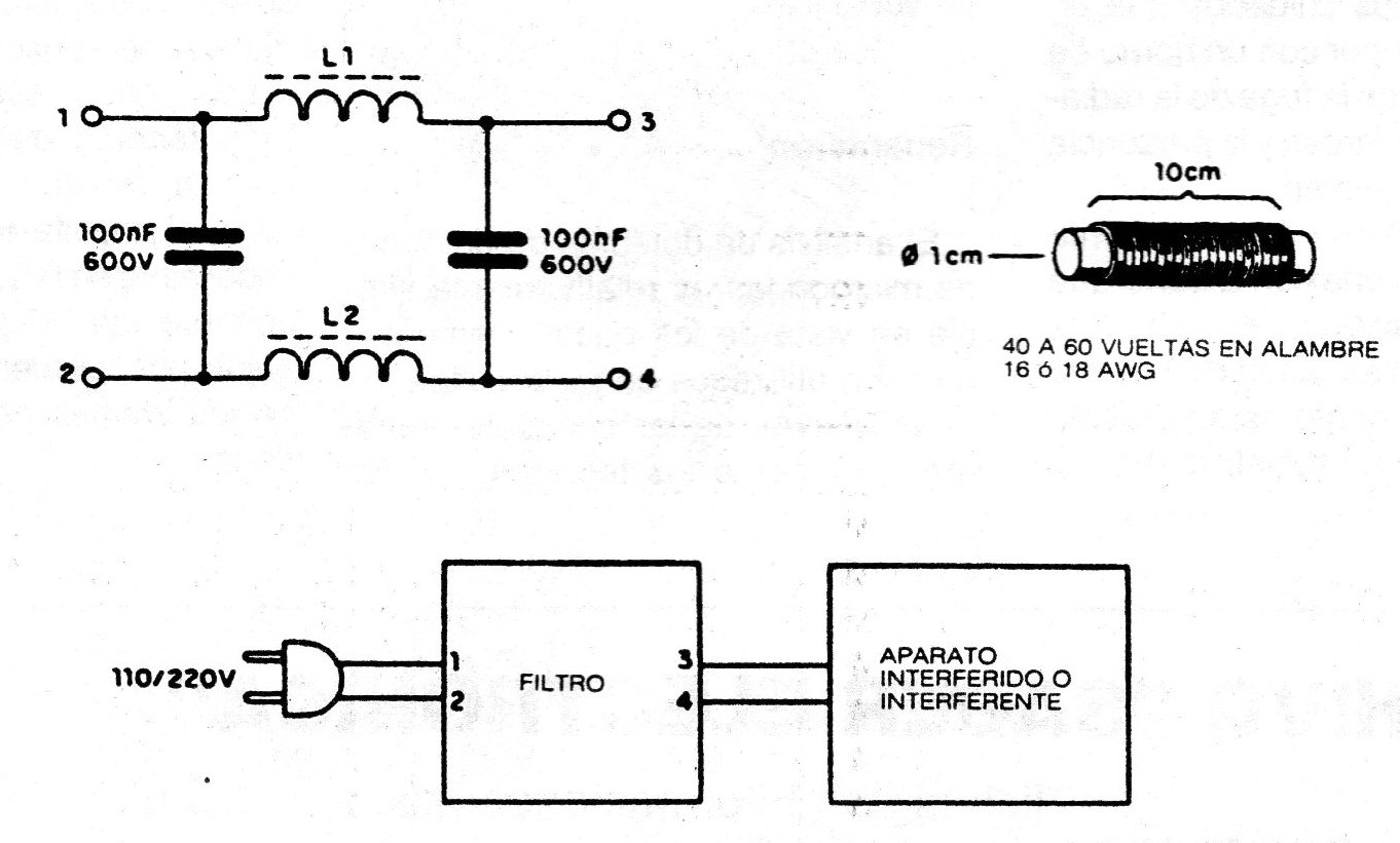 La conmutación rápida de SCRs y triacs en aparatos electrónicos ocasiona interferencias en radios y TV. Con este filtro la interferencia que se propaga por la red de alimentación puede ser reducida. El alambre de L1 y L2 debe tener un grosor compatible con la corriente del aparato interferido o interferente.