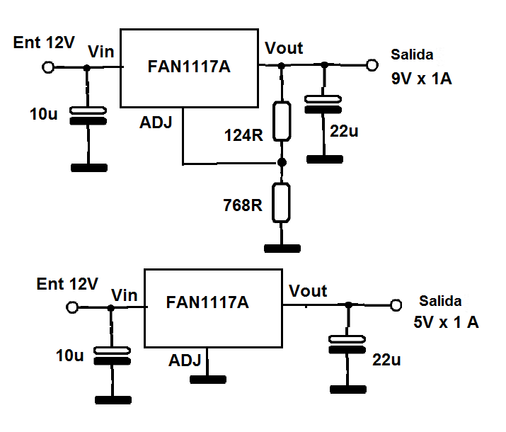 Los circuitos integrados y FAN1117A FAN1117A 5 deFairchild, consisten en reguladores fijos y ajustables para corrientes de hasta 1 A. El 5-FAN1117A es un regulador fijo para una tensión de salida de 5 V que suministra en cubierta TO-220, SOT-223 y TO-252 de tres terminales. Dado que el FAN1117A puede tener su tensión de salida ajustada a la tensión de 9 V o de otros valores a través de un divisor resistivo, como se muestra en la figura. El voltaje puede ser 1,8 V, 2,5 V, 2,85 V, 3,3 V, 5 V a 9 V. El ajuste típico es 0,05% (carga) y el dispositivo tiene una caída baja tensión en la conducción. El límite de corriente térmica es en chip.