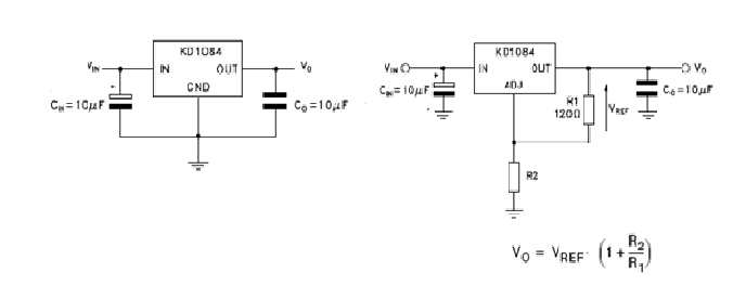 ST microelectrónica ha en su gama de reguladores lineales de baja caída de tensión KD1084xx (fijo) y KD1084Axx (ajustable), con capacidad para suministrar corrientes de hasta 5 A. Con 5 l de corriente de salida, la caída de tensión en tales dispositivos es 1.3 V. las tensiones de salida disponibles en fijos y ajustables son 1,8 V, 2,5 V y 3,3 V de salida con una tolerancia de 1%. Los dispositivos se proporcionan en cubiertas TO-220, DPAK y D2PAK. En la figura tenemos los circuitos de aplicación típicos para las versiones tensión fija y la tensión ajustable. Para determinar la tensión ajustable tenemos la fórmula para calcular el divisor que determina el voltaje de salida. La tensión de entrada máxima es de 12 V.