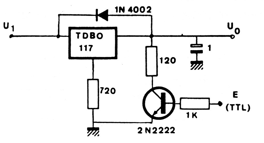 Con este circuito una señal lógica de la salida de un microcontrolador u otra configuración digital TTL puede controlar la tensión de alimentación a una carga. El corte no es total, pues la tensión permanece en 1,25 V como mínimo. El regulador es de acuerdo con la tensión deseada.