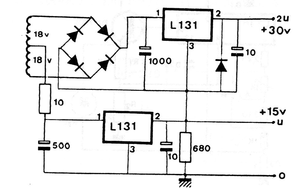 En la figura tenemos el modo de hacer la conexión de reguladores de tensión en serie para obtener una alimentación doble que también puede servir como simétrica si la referencia se toma en 15 V. Otras tensiones pueden ser obtenidas conforme a los reguladores usados.
