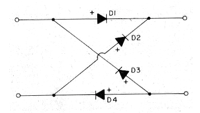 Hay circuitos que pueden quemarse si se alimentan con la polaridad invertida de la batería. Para evitar esto tenemos el circuito sugerido por 101 Electronics Projects de 1979, revista americana que ya no existe. El circuito aplica siempre la polaridad correcta en la carga, independientemente de la polaridad de la entrada. El circuito está indicado para tensiones de 6 a 12 V con corrientes hasta 1 A si se utilizan diodos 1N4002. Recuerde que existe una caída de tensión de aproximadamente 0,7 V en cada diodo, lo que resulta en 1,4 V en cada polo.