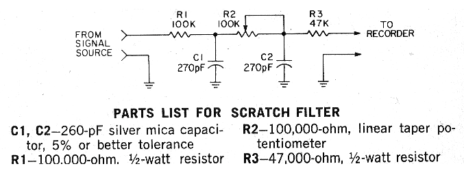 Los discos tachados y rayados producen sonidos desagradables cuando se utilizan. El circuito sugerido por 101 Electronics Circuits está conectado entre el preamplificador y la entrada del sistema de grabación (CD, MP3, etc.) para reducir estos chidos o "scratch" como se denomina en inglés, El circuito es pasivo y tiene un El único ajuste que se hace en R2. Tanto la entrada como la salida deben realizarse con cables blindados. En el original se solicita condensadores de mica plateada, difíciles de obtener actualmente. Se pueden utilizar condensadores cerámicos de buena calidad.