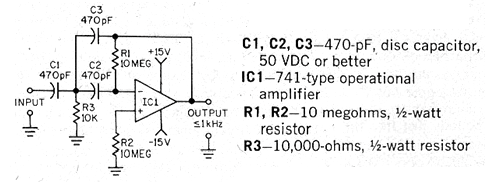 El Circuito fue sugerido por una publicación de 1979. Este circuito tiene una frecuencia de corte de 1 kHz. Todas las frecuencias por encima de este valor pasan prácticamente sin atenuación. Para otras frecuencias, vea en la sección de Matemáticas para Electrónica las fórmulas de cálculo. La fuente debe ser simétrica de 6 a 15 V, Otros operativos pueden ser utilizados.