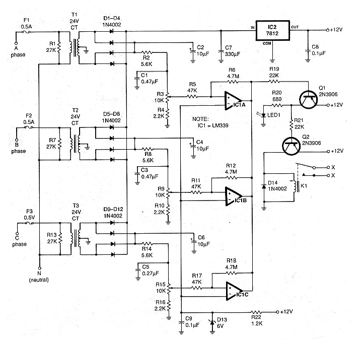 El circuito mostrado en la figura salió en un artículo de una revista Modern Electronics de 1990. La revista ya no existe, pero el circuito es actual, pudiendo ser montado con facilidad. Los transistores pueden ser cambiados por los BC558. Lo que el circuito hace es accionar un relé de alarma o apagar el motor si una de las fases de su alimentación faltar. Los transformadores tienen un secundario de 24 V con corriente de 200 a 500 mA. Los demás componentes no son críticos.