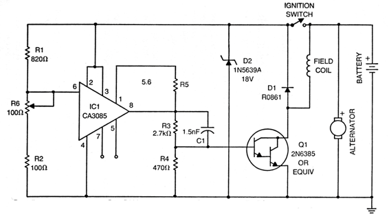 Encontramos este circuito en una antigua publicación americana de 1978. Los componentes no son más comunes en el mercado, pero se pueden utilizar equivalentes como un Darlington de al menos 10 A a Q1 y un amplificador operacional común como referencia de tensión. El circuito es para vehículos con batería de 12 V.