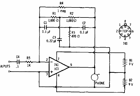 Este circuito se encontró en una documentación de Radio Shack de 1977. El circuito se sintoniza a 1,4 kHz, pero esta frecuencia se puede cambiar con el cambio de los valores de los componentes del doble T. La alimentación simétrica se puede hacer con otras tensiones y Auricular de cristal o piezoeléctrico monitorea la sintonía de la frecuencia.