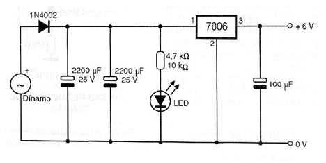 El circuito presentado en la figura está indicado para fuentes alternativas de energía como, por ejemplo, las obtenidas a partir de un dínamo en bicicleta. El dínamo se puede acoplar a sistemas mecánicos de producción de energía tales como: caídas de agua, molinos de viento, etc. El circuito integrado 7806 debe estar dotado de un buen disipador de calor y la corriente máxima obtenida en la salida no debe superar 1 amperio. Con la presencia del regulador el circuito puede alimentar con seguridad pequeños aparatos electrónicos como radios, grabadores, etc., sin el peligro de sobrecargas causadas por la fluctuación de la tensión que una dínamo común presenta cuando en funcionamiento normal. El LED sólo sirve para indicar que la energía está siendo producida, y funciona como una carga para el circuito cuando no hay nada conectado en su salida.