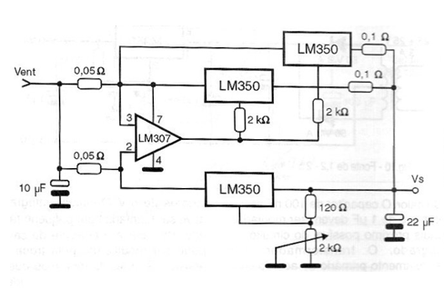 El circuito de la figura es sugerido por National Semiconductor y puede servir de base para una excelente fuente ajustable de 1,2 a 25 V con corriente de salida de hasta 10 ampères. Todos los circuitos integrados deben montarse en buenos radiadores de calor. Los resistores de 0,1 ohm en serie con los reguladores deben ser de alambre de al menos 2 W de disipación. La tensión de entrada debe ser por lo menos 2 V mayor que la tensión deseada en la salida en el punto máximo. Las pistas de circuito impreso para el montaje de este circuito regulador tienen que ser lo suficientemente amplias para que puedan trabajar con las altas intensidades de las corrientes de salida.