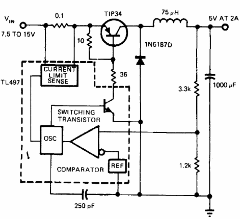 Encontramos este circuito en una documentación técnica de Texas Instruments. Los resistores determinan la frecuencia que puede ser elegida para mayor rendimiento.