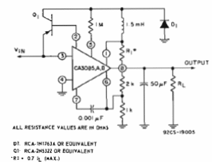 El circuito presentado es de una documentación técnica de la RCA de 1972. El circuito integrado consiste en un regulador de tensión de la época y el transistor depende de la corriente deseada en la salida. Junto al circuito están las fórmulas para el cálculo de los diversos componentes.