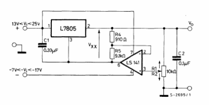 Encontramos este circuito, que requiere fuente simétrica, en el manual de circuitos integrados lineales de la SGS de 1982. El operacional puede ser el 741 y la corriente máxima es de 1 A. El 7805 debe estar dotado de radiador de calor.