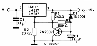 Al conectar, la tensión de salida de este regulador sube lentamente hasta llegar a los 15 V. La tasa de crecimiento de la tensión depende de C1. El circuito es del manual de circuitos integrados lineales de la SGS de 1982. El circuito integrado debe estar dotado de radiador de calor y el transistor puede ser el BC558.