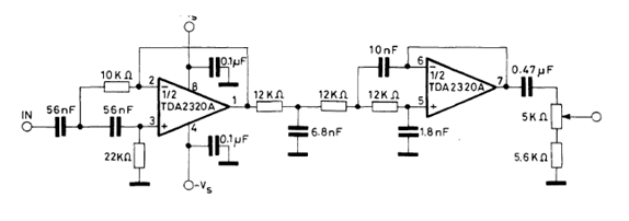 Este filtro de banda pasante para el rango de medios se puede utilizar en sistemas divisores de tres altavoces, deja pasar el rango de frecuencias entre 200 Hz y 2000 Hz. La alimentación debe realizarse con una fuente simétrica de 15 V. El circuito es el manual de circuitos integrados lineales de la SGA de 1982.