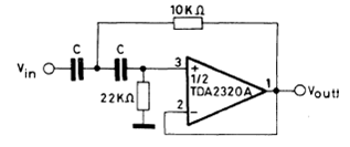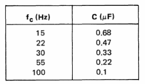 Este circuito corta las frecuencias por debajo de los valores de la tabla, que dependen del capacitor C, eliminando así las oscilaciones de baja frecuencia que ocurren por los cambios de velocidad del motor de un tocadiscos. El circuito es del manual de circuitos integrados lineales de la SGS. El circuito integrado utilizado puede ser reemplazado por un funcionamiento de uso general.
