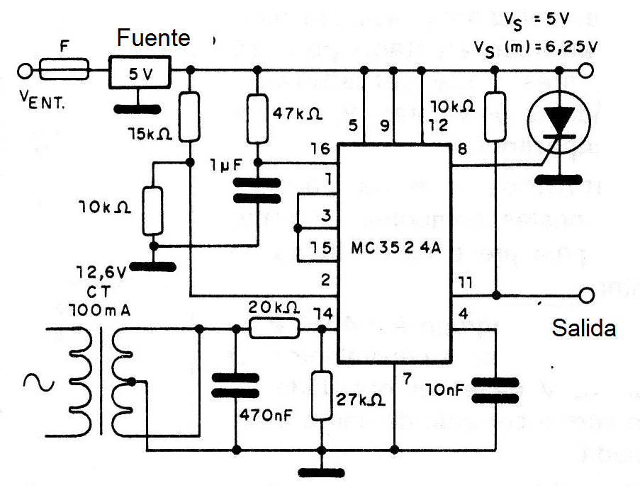 Este circuito es sugerido por Motorola como base en el circuito integrado MC3324 A y posee una salida detectora de pérdidas de línea. El sistema es del tipo Crossbar en el que se dispara un SCR cuando se produce la sobretensión, colocando rápidamente en corto la salida y evitando problemas para la carga alimentada. El SCR debe elegirse de acuerdo con las características de la fuente y, por lo tanto, también el fusible. El MC3324 consiste en un doble comparador de tensión diseñado especialmente para la supervisión de fuentes de alimentación. Este integrado puede funcionar con tensiones de 4,5 a 40 voltios y su salida puede proporcionar una corriente de 300 mA (pin 8 y pin 10) para el disparo de SCR.