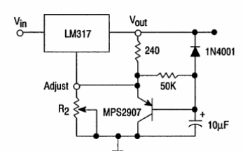 Esta configuración se encuentra en otros manuales de los fabricantes del LM317. Se trata de un circuito regulador en el que la tensión de salida sube lentamente al conectarse. El circuito es del Linear Interfaz IC de Motorola de 1993.