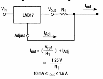 La corriente máxima de salida de este circuito de corriente constante es de 1,5 A. El circuito es del Linear Interfaz IC de Motorola de 1993. El circuito integrado debe estar dotado de radiador de calor. Las fórmulas para el cálculo de la corriente están junto al diagrama.