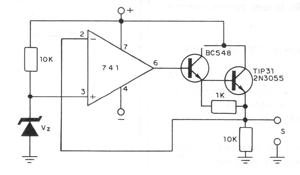 Este circuito utiliza un operacional 741 y dos transistores para obtener una tensión regulada que depende del zener utilizado. La tensión de entrada debe ser mayor que la deseada en la salida y la fuente debe tener alimentación simétrica. El transistor de potencia debe montarse en un disipador de calor.