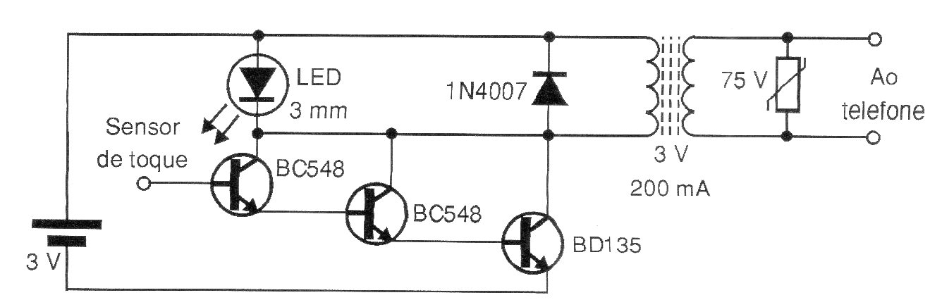 Este circuito fue encontrado en una documentación de 2006. Con él el timbre de un teléfono puede ser probado. Al tocar el sensor, el circuito inyecta en la línea una señal de llamada. El transformador tiene primario de acuerdo con la red de energía y secundario de 3 V y el transistor BD135 debe estar dotado de un pequeño disipador de calor.