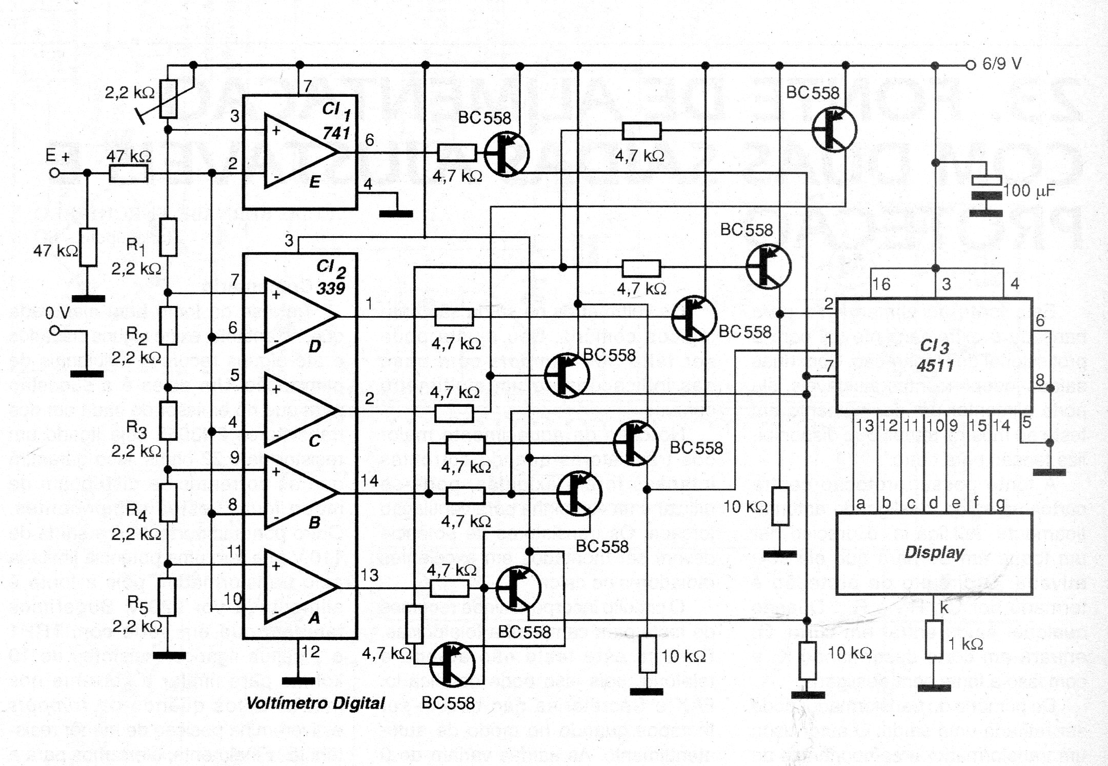 Este es un circuito simple de voltímetro de sólo 1 dígito usando comparadores de tensión. Se encontró en una documentación de 2004 debiendo ser alimentado con tensiones de 6 a 9 V. El trimpot ajusta la escala y la pantalla usada es de 7 segmentos con cátodo común.