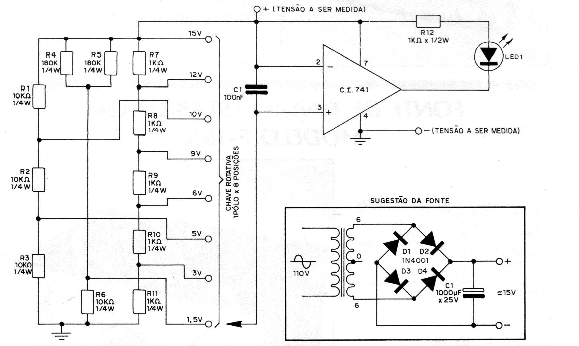 Este circuito para las bandas de 1,5 a 15 V escalonadas fue encontrado en una documentación de 1982, pero utiliza componentes actuales, siendo dada también la fuente de alimentación. Con cambios, puede ser utilizado como escudo de entrada o incluso de monitoreo para accionadores. En la publicación original hay una conexión entre la entrada y alimentación del CI. No existe. El CI debe ser alimentado con 15 V de la fuente indicada.