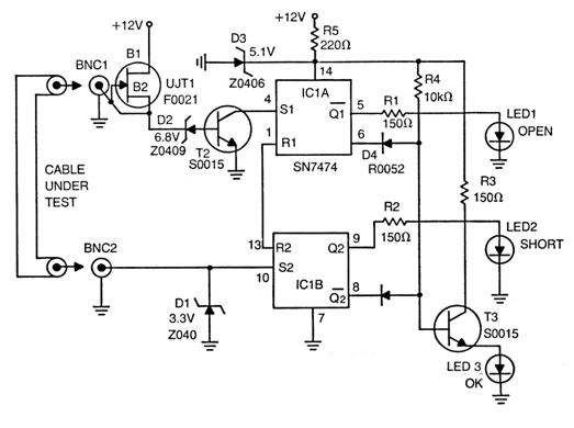 Encontramos este circuito en una publicación de los años 70, pero él puede ser montado aún hoy con el cambio de los transistores por tipos más modernos. Para el UJT podemos usar el 2N2646 y para los demás podemos usar los 2N2222 o BC548. El circuito es alimentado por fuente de 12 V y el circuito 7474 es de la serie normal TTL. Un zener de 5 V estabiliza la tensión de alimentación de este circuito integrado. La indicación de estado, abierto, corto o bueno es dada por 3 LEDs que pueden ser de colores diferentes.