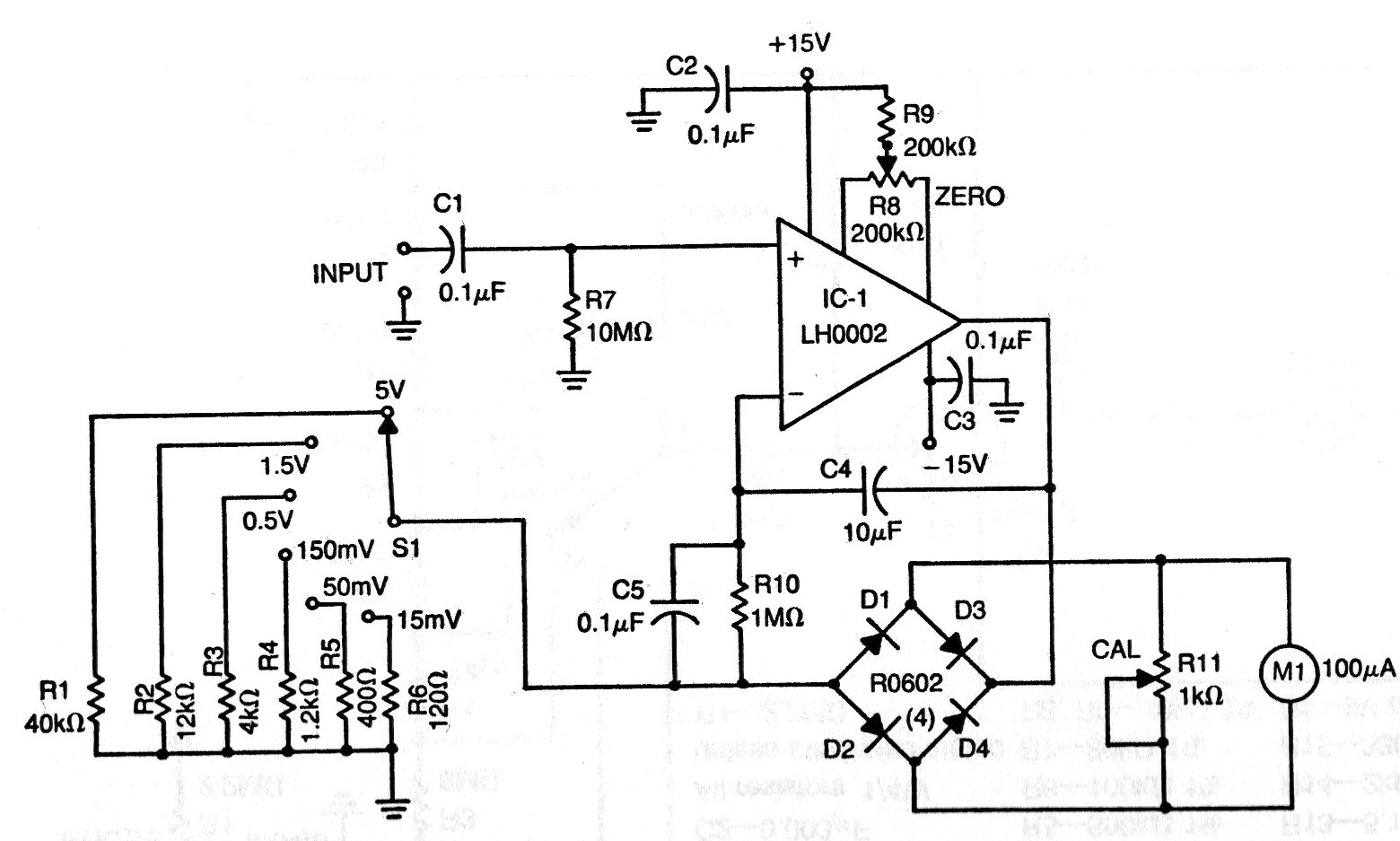 Este interesante circuito, encontrado en una antigua publicación americana, mide señales alternadas en un rango de frecuencias de 100 Hz a 500 Hz. El amplificador operacional no es común actualmente, pudiéndose utilizar en su lugar un CA3140, por ejemplo. En este caso, la alimentación puede ser menor, con tensiones de 6 a 12 V. La fuente debe ser simétrica y los diodos del puente pueden ser los 1N4148. La precisión de las medidas dependerá de las resistencias de entrada.