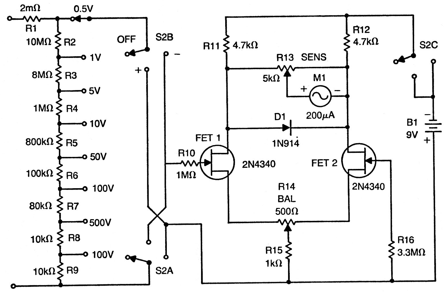 Este voltímetro analógico con gran sensibilidad y resistencia de entrada tiene una configuración tradicional encontrada en muchas publicaciones. El circuito es de una documentación de los años 70, pero puede ser montado con facilidad con transistores BF245 o MPF102. El circuito es alimentado por una batería de 9 V con un consumo muy bajo. La precisión del circuito depende exclusivamente de la precisión de los resistores usados en la entrada del circuito. R1 es en realidad de 2,2 M ohms y no 2 mOhms como se indica en el original.