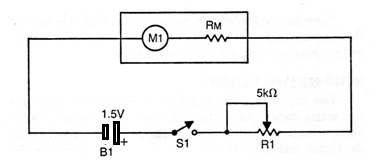 Este circuito proporciona una medida precisa de la resistencia interna de un instrumento analógico. Basta accionar el circuito y ajustar el potenciómetro de 5k (4k7) a media escala del instrumento. Cuando esto ocurra, la resistencia ajustada es igual a la del instrumento. El circuito es alimentado por una sola pila común. Es conveniente conectar en serie con el circuito un resistor de 1k para evitar una corriente de cortocircuito en el instrumento, causando su quema si su resistencia es muy baja.