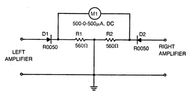 Este simple circuito indica cuando los dos canales de un equipo estéreo están balanceados. Los diodos pueden ser los 1N4002 o 1N4004 y el indicador es un microamperímetro con cero en el centro de la escala. El circuito se conecta a las salidas del amplificador. Es conveniente conectar en serie con el instrumento indicador una resistencia de 1k a 4k7, dependiendo de la potencia del amplificador.