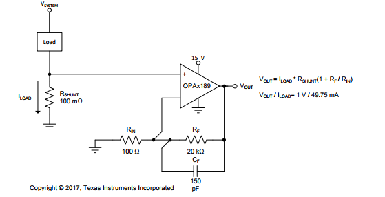 Este circuito con el operacional OPAx198 de Texas Instruments monitorea la corriente en una carga de lado bajo (low-side). La tensión de salida se calcula en función de los componentes según la fórmula junto al diagrama. Más información se puede obtener en el datasheet del componente