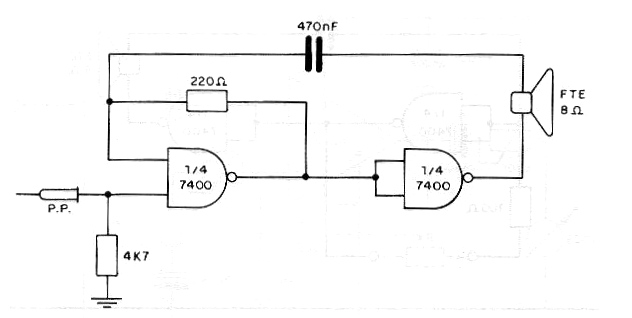 Con la punta de prueba en el nivel alto, el altavoz de este circuito TTL emite sonido. En el nivel bajo no hay sonido. En la información del sitio la pinza del 7400. La alimentación puede ser retirada del propio circuito que está siendo analizado, pues el consumo del circuito es muy bajo. El capacitor de 470 nF se puede cambiar para modificar la frecuencia de la señal emitida.