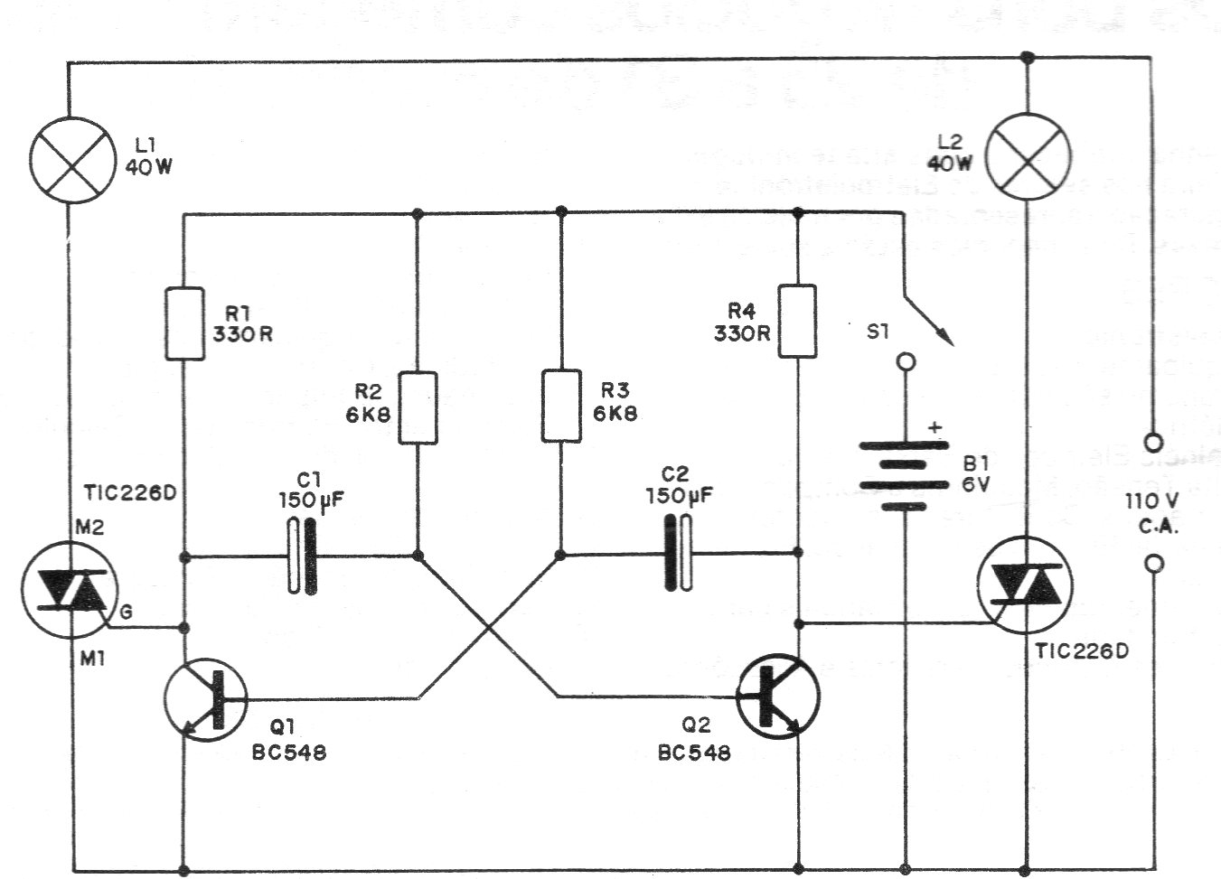 Este circuito hace que dos lámparas incandescentes parpadeen alternadamente a una velocidad determinada por los valores de los capacitores. El circuito no funciona con otros tipos de lámparas y los triacs deben estar dotados de disipadores de calor. El multivibrador puede ser alimentado por pilas o por una fuente con transformador.