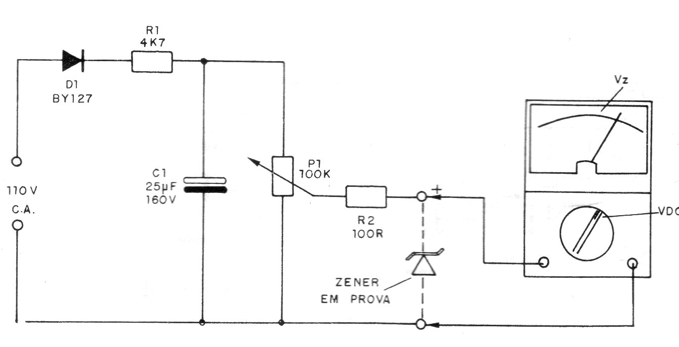 Este circuito fue encontrado en una publicación de 1987, pero todavía es válido hoy. Lo que se hace es ajustar gradualmente la tensión de salida hasta que se estabilice por la presencia del zener. Basta entonces leer en el multímetro el valor de esta tensión que es la tensión del diodo zener.