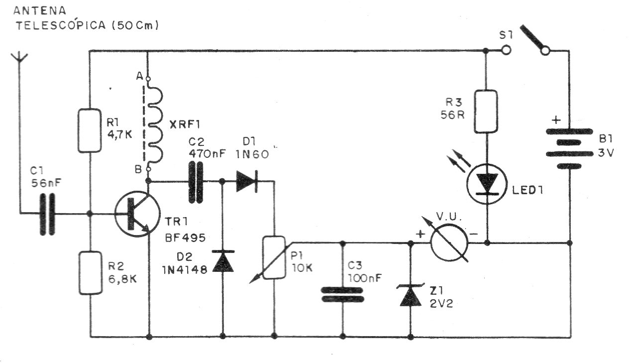 Este circuito es más sensible que el anterior, pues utiliza una etapa de amplificación del transistor. La bobina es similar a la del diseño anterior y la antena es del tipo telescópico de al menos 50 cm de longitud. El ajuste de sensibilidad y punto de nulo se realiza en P1. La alimentación viene de dos pilas pequeñas comunes. El VU es del mismo tipo indicado en el proyecto anterior.
