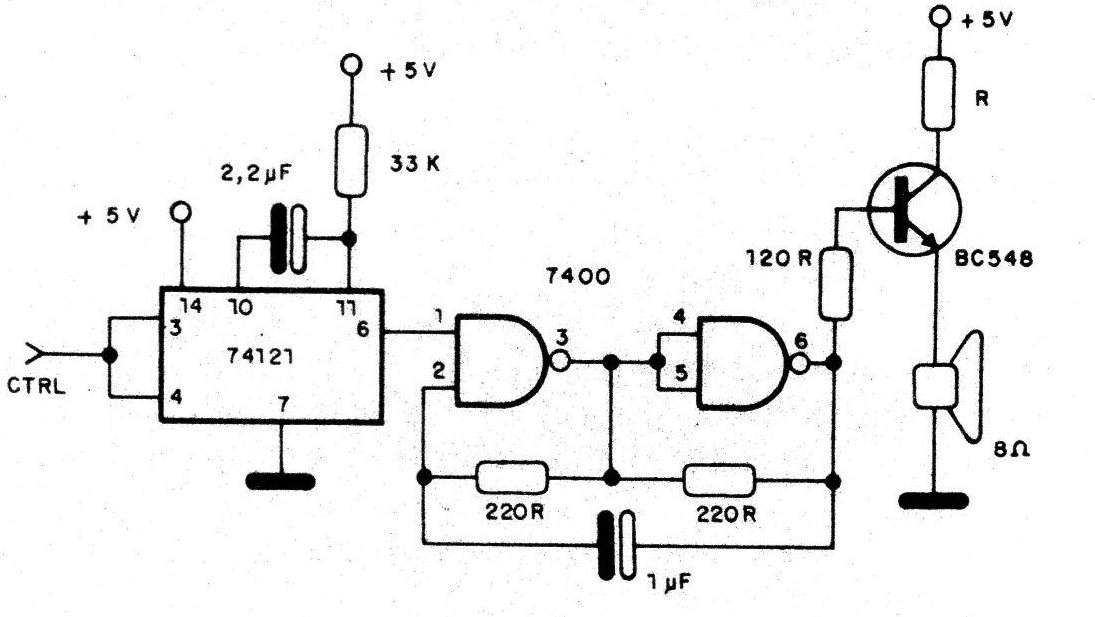 La presencia de un pulso en la entrada CTRL produce una señal de audio de duración determinada por el capacitor de 2,2 uF. Esta señal tiene la frecuencia dada por el capacitor de 1 uF, que puede ser alterado en el rango de 220 nF hasta 2,2 uF. El resistor R en serie con el transistor BCS48 determina el nivel de audio, pudiendo tener valores entre 47 y 220 ohms, típicamente. La alimentación del 7400 se realiza en los pines 14 y 7. Recordamos que el 74121 consiste en un monoestable, disparado externamente por los pines 3 y 4. El circuito se puede utilizar como shield.