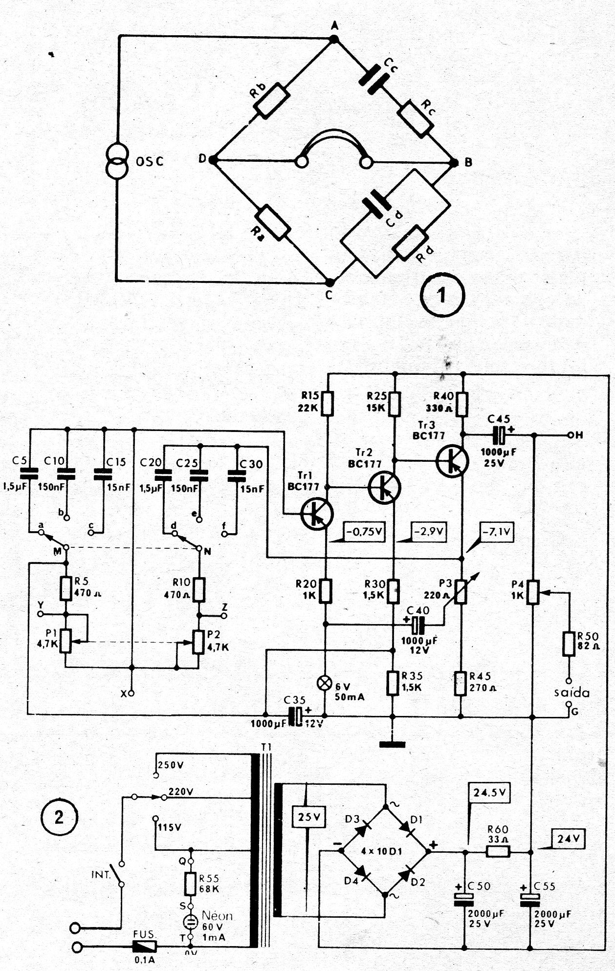 Un generador de baja frecuencia o de audio-frecuencia es un instrumento casi imprescindible en el que opera en el campo de amplificadores y adyacencias. El esquema que vamos a presentar es vendido en kits por la firma británica AMTRON. Pero, como la misma no presenta sus productos en Brasil, hacemos, fecha venia, la presentación del esquema para elucidación de nuestros lectores. El rango de alcance del generador de audio-frecuencia es de 15 a 22.000 Hz, en tres bandas seleccionables por la de dos polos, tres posiciones MN. La salida máxima es de 2 volts efectivos, con una linealidad de 1,5 dB para más o menos y una distorsión máxima del 1% en todas las frecuencias. El circuito es clásico de un puente de Wien, cuyo principio básico se puede apreciar en la figura 1. Este puente deriva del puente de Wheatstone, que se utiliza para la medida de capacitores y resistores. No daremos aquí el tratamiento teórico del funcionamiento del Puente de Wien, porque nuestro interés es divulgar un circuito fácil de construcción simple, para el hombre de bancada o experimentador que desea construir sus propios instrumentos. Todos los valores están en el esquema de la figura 2. El único ajuste necesario, antes de utilizar el generador de audio-frecuencia se efectúa a través de P3 de 220 ohms. Se coloca a la salida del generador un voltímetro, en la escala que permita observar entre 1,5 y 3 volts. Se coloca la llave selectora MN en la posición b y se sitúa el potenciómetro P1-P2 en la posición que sea equivalente a 1.000 Hz y se ajusta P3 para que el voltaje sea de 2 V.