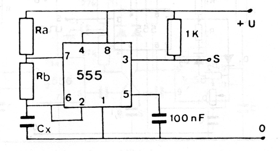 La frecuencia de un oscilador 555 depende de la capacitancia del capacitor C. Podemos aprovecharlo en un simple capacímetro en el que la salida está ligada a un frecuencímetro. Los resistores, entre 2k2 y 47k dependen del rango de capacitancias que se desea medir. La alimentación puede oscilar entre 5 y 15 V.