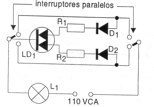 Este circuito monitorea el accionamiento de una lámpara u otra carga a través de interruptores paralelos o de dos vías. El circuito también funciona en 220 V. Para 110 V las resistencias son de 47k x ½ W y para 220 V de 100k x ½ W. Los LED bicolores comunes se pueden utilizar.