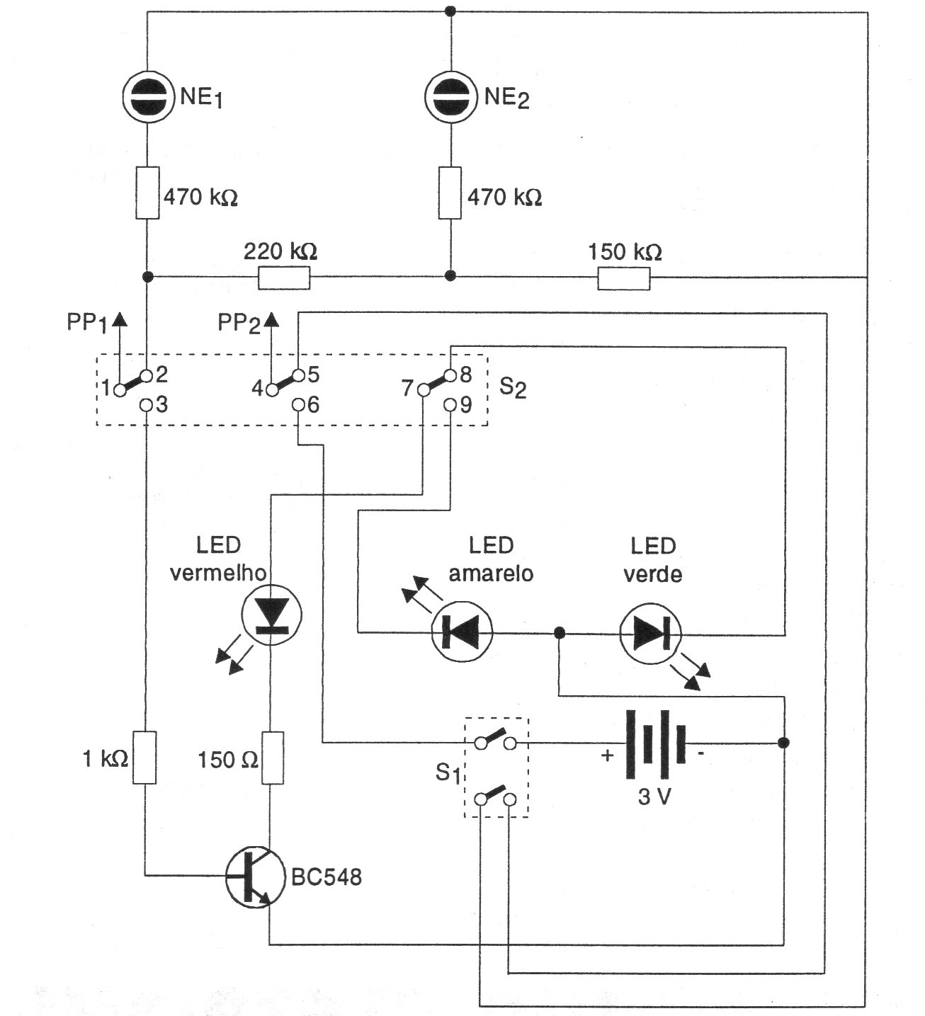 Este circuito combina un probador de continuidad con indicación por LED con un voltímetro neón para la red de energía. El sector de continuidad es alimentado por dos pilas y tiene buena sensibilidad. El circuito tiene una llave conmutadora para las funciones.