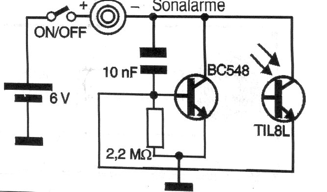Este simple circuito utiliza como sensor un foto-transistor común, haciendo encender un LED cuando recibe el infrarrojo de un control remoto. El circuito se alimenta con 4 pilas comunes. En el caso el indicador es un sonalert o buzzer con oscilador para 6 V.