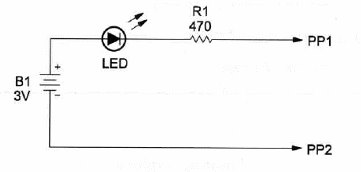 Este es un probador de continuidad o prueba universal muy simple de montar. El LED se ilumina cuando la continuidad es detectada por las puntas de prueba. El circuito también puede ser alimentado con 6 V, cambiando R1 por un resistor de 1 k. El circuito es del libro Fun Projects for the Experimenter de Newton C. Braga.