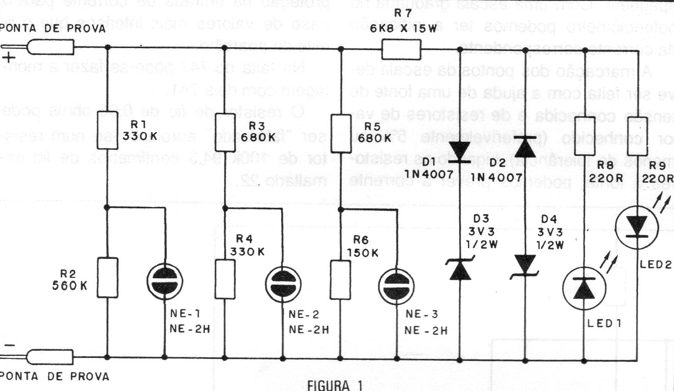 Encontramos este circuito en una documentación de 1987. Se trata de un multi-probador con lámpara neón y LEDs funcionando tanto con baja tensión continua como alta tensión alterna.
