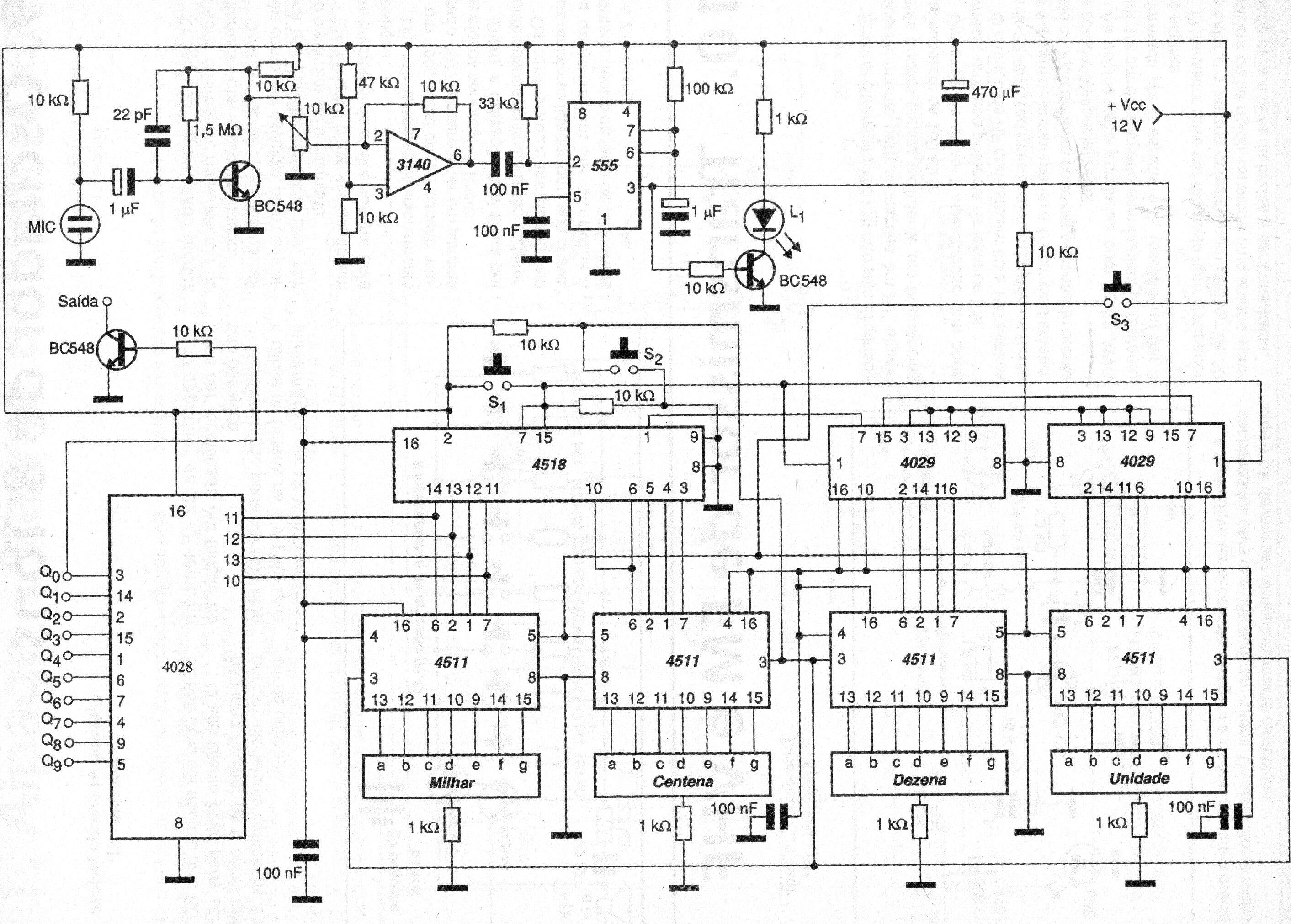 Este circuito de 2003 sirve para mostrar digitalmente la intensidad de un sonido captado por un micrófono. Funcionamiento: el micrófono de electreto recibe la señal sonora muestreada y lo transforma en una señal eléctrica correspondiente que es amplificada por el transistor BC548. Una vez amplificado la señal pasa al amplificador operacional CA3140 que tiene su salida conectada a un monoestable con el CI 555. Este CI produce impulsos proporcionales a la intensidad de la señal enviándolos al CI 4515. Cada uno de los CIs produce una secuencia binaria para los decodificadores formados por los CIs 4511. Estos CIs alimentan los displays de cátodo común. El CI4518 contiene un doble contador y su segundo contador está conectado al CI 4028 que excita LEDs conectados en sus salidas, accionando así cargas de mayor corriente a través de transistores. Después de cada cuenta tenemos el accionamiento de la salida lo que permite visualizar la secuencia de ese conteo. S1 reseta el conteo, cerrando los displays. S2 prueba todos los segmentos de los displays. S3 bloquea la cuenta. L1 indica la señal de reloj, cuanto más rápida sea la oscilación de la señal de entrada, más rápidas serán los parpadeos del LED.
