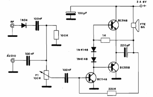 Este circuito consta de un amplificador de audio de buen rendimiento, alimentado por dos o cuatro pilas y tenemos dos entradas: una para señales de audio y la otra para señales de RF. El potenciómetro sirve como control de sensibilidad o volumen. El altavoz puede ser de cualquier tipo de 5 a 10 cm y el aparato se puede instalar en una pequeña caja. Artículos en el sitio enseñan cómo usarlo.