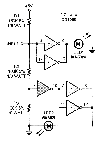 Este circuito fue publicado en una revista americana de 2001, que ya no existe. Su propósito es detectar niveles lógicos en salidas tanto CMOS como TTL. La alimentación viene del propio circuito analizado y los LED pueden ser comunes, preferiblemente un verde y otro rojo. La alimentación del CI se realiza en los pines 8 y 16. Vea en el libro Curso de Electrónica Digital el pinaje completo del 4009.
