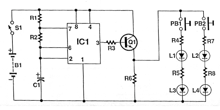 Este circuito fue encontrado en el Electronics Handbook, Vol XIII de 1993 y consiste en un simple indicador de dirección o flecha, para bicicletas. El circuito se activa cuando se presiona PB1 o PB2 estando S1 cerrada. Los LEDs son comunes y el circuito se alimenta con 4 pilas pequeñas. Los componentes se enumeran en la lista siguiente: